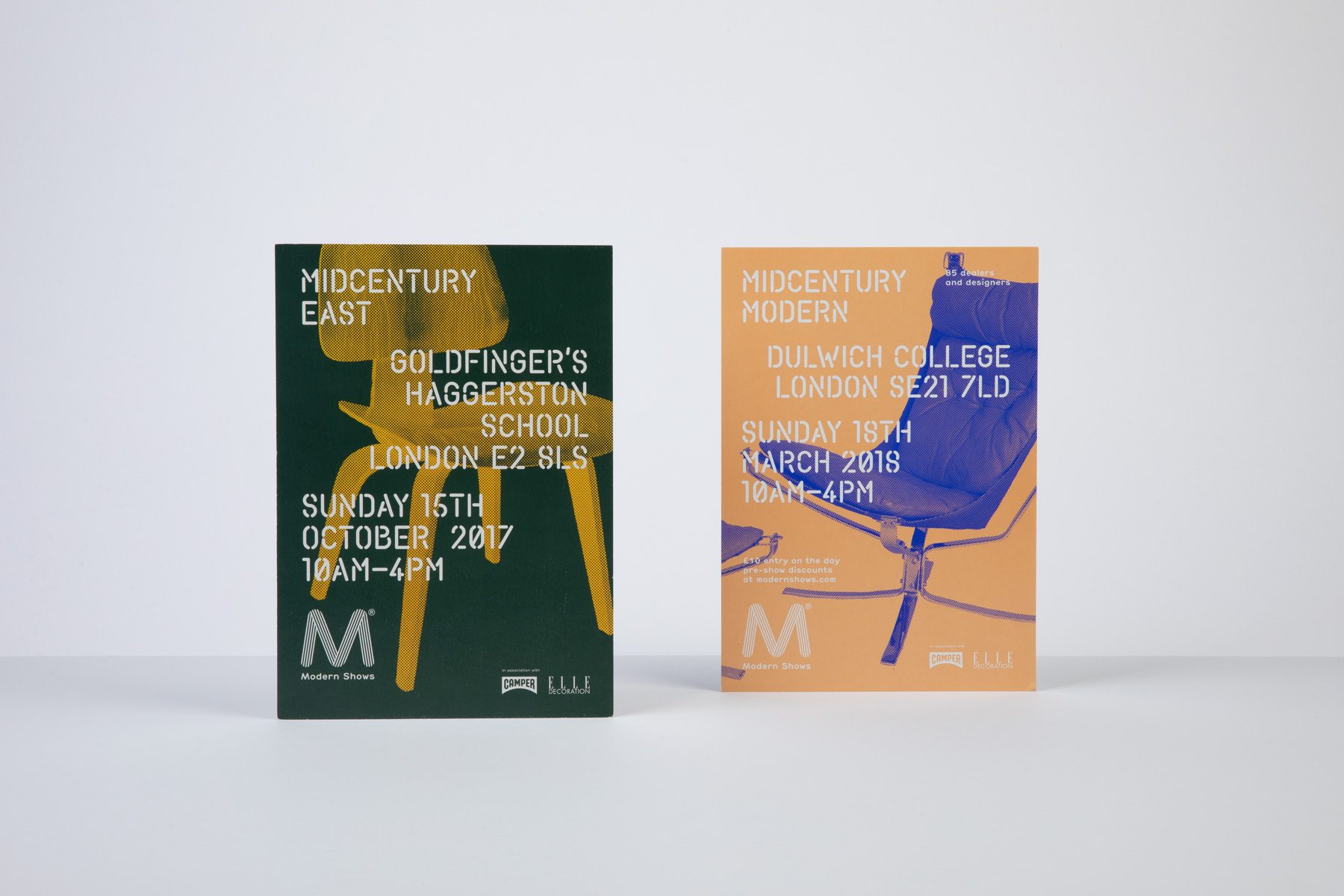During our long-standing collaboration our work has included visual identity, website design and development, and print design. Flyers for the fairs feature silhouettes of recognisable mid-century furnitur